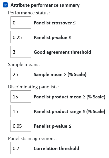To generate the Attribute Performance Summary sheet, under 2. Select Options , select Attribute performance summary. Adjust the thresholds as required.